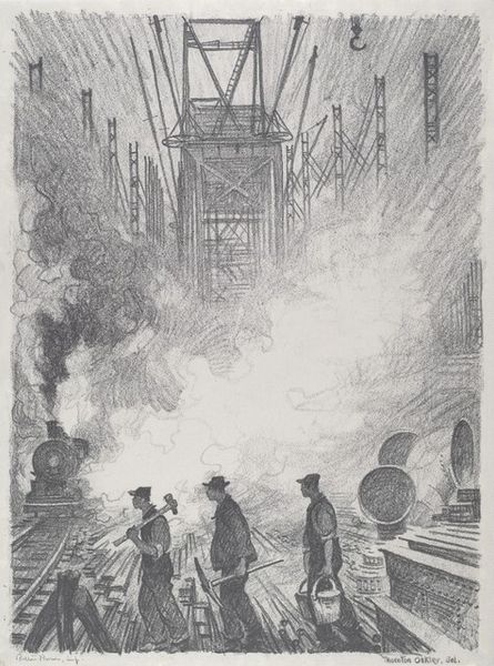 Joseph Webster Golinkin made this drawing called 'Red Flags' with what looks like graphite on paper. The way he builds up the tones is really interesting. It's all these tiny, scribbly marks that together create a really dense and atmospheric scene, kind of like a news photo from the 30's. The surface has this beautiful, almost velvety texture because of all those marks. You can almost feel the grit and grime of the city. Look at the way he draws the smoke billowing from the manhole, it's like it has weight to it. And then see how he uses the same kind of marks to describe the sleek, reflective surfaces of the cars, it's a nice contrast. Those flags, signaling danger, make me think about the red flags we face everyday, big and small, and how we navigate them. I’m reminded of some of the social realist drawings of the period, like the work of Jacob Lawrence, which also captured scenes of everyday life with a real sense of urgency and empathy. Art is always talking to art, you know?