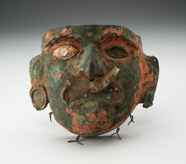 Editor: Here we have a bronze mask from the Moche culture, dating from about 100 to 500 AD. The expression is surprisingly serene considering the material and likely age. What stands out to you about it? Curator: I am particularly struck by the material contrasts inherent in this object. Note the tension between the patinated bronze, aged through centuries of oxidization, and the gleaming, presumably polished inlays of the eyes. How does this contrast shape your perception of the mask’s surface, its depth, and the dimensionality of the facial features? Editor: I hadn't considered that specific interplay. The different textures really do bring the face forward, particularly the eyes. The wired eyebrows almost look like they were added later, separately. Do they play a role in the mask's symbolism or composition? Curator: The eyebrows contribute to the mask's striking use of line, but perhaps even more significant is the contrast between the smooth, planar surfaces of the face itself and the implied three-dimensionality of these protruding details. This juxtaposition enhances the mask's expressiveness without relying on traditional sculptural depth. Can you perceive how these features change your understanding of the work's symbolic purpose? Editor: I guess the protruding features force a closer, more intimate examination, drawing me into some kind of engagement with the portrayed subject, or idea of the subject, behind the mask. Curator: Precisely. The sculptor leverages contrast and materiality to transcend mere representation. The interplay of depth and flatness serves not just to depict, but to evoke. It asks us to ponder the object's presence as a physical form engaging in symbolic performance through semiotics, transcending cultures throughout its own aging, time, and evolution. Editor: That makes a lot of sense. Thank you for pointing out the material contrasts; I will try to notice how those formal qualities influence my reactions more often. Curator: It is in the careful observation of these intrinsic qualities that we truly engage with the essence of the art.