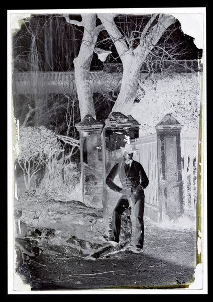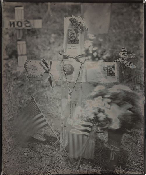 Curator: Standing before us is Binh Danh's poignant mixed-media piece, "Army PFC., James J. Coon," created in 2014. It’s a photograph, but also more than that, isn't it? Editor: Haunting is the first word that comes to mind. The high-contrast black and white amplifies the desolation, those crosses receding into the distance...it speaks volumes about loss, even before you know the subject matter. Curator: It does. Danh layers images and meaning in a way that transcends traditional photography. He’s using a daguerreotype process, which itself evokes the past. The soldier's grave marker becomes both a memorial and a ghostly trace. Editor: Absolutely. The cross, of course, is loaded with symbolic weight – sacrifice, faith, memory. But even the helmet perched on top…it feels so personal, so vulnerable. What are your thoughts about Danh’s use of objects in this landscape? Curator: For me, these elements introduce a tangible connection to PFC Coon’s reality, humanising him beyond just another name on a cross. Danh often explores themes of memory and war through innovative methods; there is a reverence in how the photograph captures the cross nestled within a sea of other crosses. The starkness almost evokes absence but conversely highlights life. Editor: It brings to mind other memorials too, especially in its layout. It shares DNA with places of memory that try to grapple with representing something immense like human loss at a national scale. The flag adds another layer to all the meaning that's happening here: Patriotism, country, identity. They all clash in a place like this. Curator: Precisely, there is a confluence of narratives – loss, patriotism, remembrance – and the daguerreotype imbues the work with a gravitas that connects us directly with both the past and this continuing present reality of war. Editor: I'm left wondering how we move forward and remember in our culture today with pieces like this showing us, uncomfortably, where we already stand. It encourages meditation; Danh challenges us. Curator: A powerful act of witnessing and remembering, rendered with a fragile beauty, a beauty even within all that desolation and meaning.