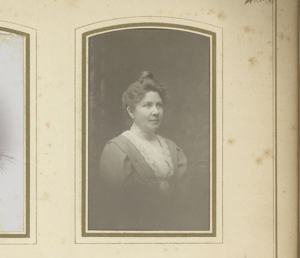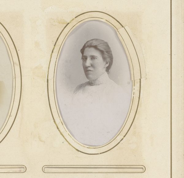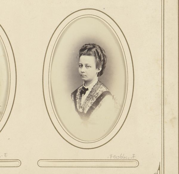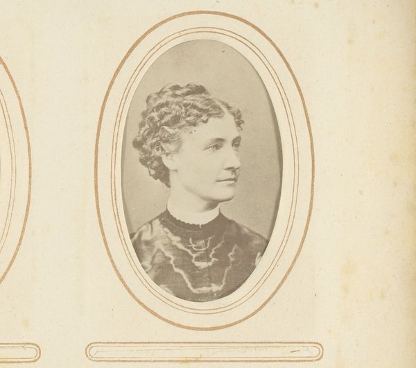 Editor: So this albumen print, "Portret van een vrouw," probably taken sometime between 1860 and 1895 by Hills & Saunders... There’s a delicate formality to it, like peering into a bygone era. What do you see in this portrait? Curator: The oval frame immediately evokes a locket, a tangible piece of memory. Notice the lace at the throat, a deliberate choice. Lace, throughout history, signified status and meticulous craftsmanship. It spoke of refinement, of time well spent. Consider the woman’s gaze. Direct, yet somehow reserved. What do you make of it? Editor: It’s a confident gaze, but almost melancholic too, as though aware of the performance involved in portraiture. Curator: Precisely! And that’s where the image transcends a mere likeness. It enters the realm of ritual, where societal expectations and individual identity negotiate with each other. Her tightly controlled hairstyle, contrasted with the softening effect of the lace, highlights that tension. Think about the weight carried by women during this period, socially, economically. What do these visual cues suggest about her identity, her potential story? Editor: It makes me wonder about her aspirations versus the roles available to her then. It's more than just a pretty picture; it's a time capsule of cultural pressures. Curator: Indeed. And the power of symbols like these, these visual echoes of history, continue to resonate even today, shaping our understanding of the past and present. It's a quiet, potent dialogue across time. Editor: Looking at it now, I’m thinking less about her beauty and more about her position in society. Fascinating!