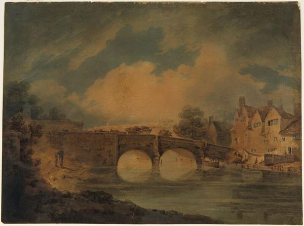 Curator: Turner's "Old London Bridge (after Samuel Scott, N00313)" captures the essence of a bygone era, a bustling Thames teeming with life. There's a palpable energy, wouldn’t you say? Editor: It looks almost…smoggy? The light feels heavy, and you can feel the weight of all those buildings pressing down on the river. It’s about industry and commerce. Curator: Exactly, and it's interesting to see Turner's version of Samuel Scott’s work. Turner’s ability to render atmosphere is extraordinary. You can practically smell the river! Editor: I wonder about the laborers here, who moved the materials that made this bridge, where did they come from, and what were their lives like? The painting itself is a testament to this labor. Curator: That’s a fitting thought. It's a reminder of the bridge's role as a structure for trade and movement. Editor: Absolutely. It's a bridge between eras, not just locations, a thought that makes you appreciate the painting even more.