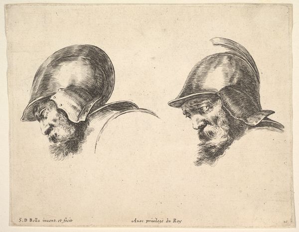 Editor: We're looking at Stefano della Bella's "Head of a frightened soldier wearing a helmet," etched around 1641. It's intense, the face contorted in what seems like pure terror. What historical narratives might be embedded in an image like this? Curator: Indeed. Look closer – the individual’s emotional state, rendered with such visceral intensity, invites us to question the conventional heroic narratives often associated with war and soldiers during the Baroque period. What assumptions are disrupted when we're confronted with vulnerability, even fear, in those contexts? Editor: So, instead of glorifying war, it critiques it? Curator: Perhaps. Or at least, it provides a counter-narrative. Think about the socio-political landscape of 17th-century Europe – rife with religious conflict, the Thirty Years’ War raging on. This piece might be interpreted as a poignant commentary on the psychological toll exacted upon the common soldier, whose voice is often absent from history. Could it also be an expression on toxic masculinity? Editor: I never thought about it that way; I guess art can serve as evidence of humanity beyond the battlefield. Do you see any contemporary links? Curator: Absolutely. In today's world of constant global conflict and discussions on PTSD, mental health awareness and the ongoing struggle of veterans. Images like this gain renewed resonance. This piece challenges us to see the individual, with all their anxieties and humanity, caught within systems of violence. Editor: It is relevant. Thank you! I learned to observe not only the face, but the human too. Curator: Agreed, the exploration of emotional vulnerability, especially within militarized contexts, remains profoundly important and continues to ignite critical conversation.