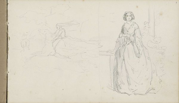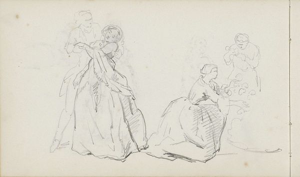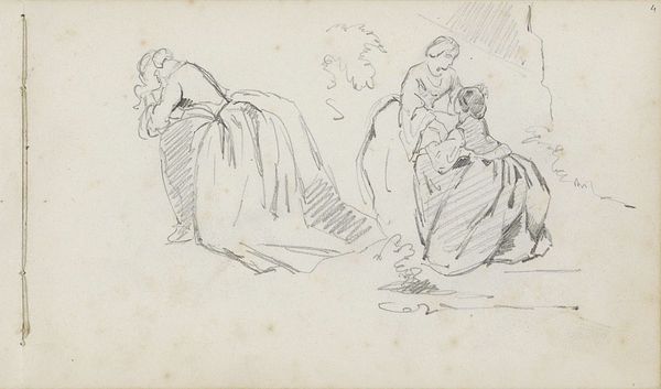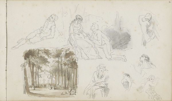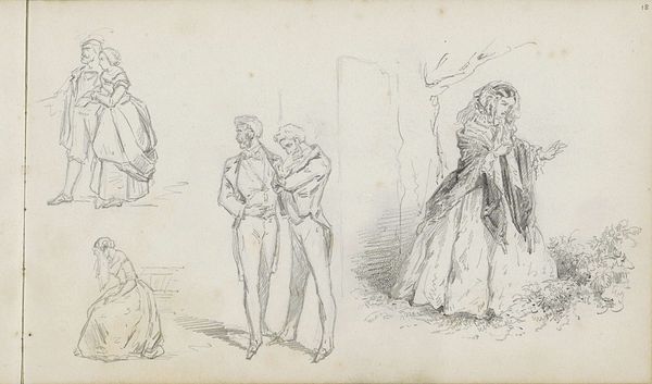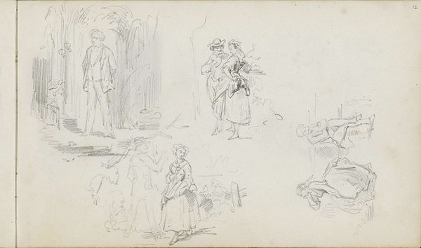 Curator: This drawing, “Liefdespaar bij een boom,” or “Couple in Love by a Tree,” is by Charles Rochussen, created sometime between 1840 and 1860. It’s a pencil drawing on paper. What's your immediate reaction to this piece? Editor: It strikes me as incredibly delicate, almost ephemeral. The light pencil work gives it an airy quality, and you can practically feel the toned paper beneath the marks. Curator: Absolutely. Rochussen's skill in handling pencil and paper transforms an ordinary scene into something rather compelling. Given that Rochussen primarily produced illustrations and genre paintings, consider how labor practices in the print industry may have influenced his technique with drawing media. Editor: True. And I think there's a real sense of theatre here, with these figures arranged in distinct groupings. It feels like a captured moment from a play, doesn't it? How the location in the Rijksmuseum may affect how people perceive this piece. Curator: Precisely! That dramatic element speaks to the wider culture of Romanticism, of course. Think about the social role of public displays of affection and courtship at this time. Rochussen, through this image, becomes both observer and participant in that culture. Editor: I see that too, and the material sketch seems quite progressive for its time. Also interesting is the scale and layout of the figures within the work itself. Are those all scenes in a single go or fragments stitched together to evoke an array of people near one another? Curator: It's difficult to know precisely what Rochussen had in mind, I think that is part of its inherent appeal to a modern audience. But it speaks to ideas of image production at that time as well, a study that may then feed other work. The piece embodies what he could make with the simplest of raw materials, the interplay of pencil and paper, tone and texture. It speaks volumes about artistic possibilities through humble, readily accessible components. Editor: In many ways the final image leaves us in this position of a personal, uninhibited snapshot. As viewers, the artwork, whatever the initial intentions were, invites a more casual approach than may have been afforded in a gallery exhibiting high oil paint portraits of the same period. Curator: An insightful interpretation! It speaks to the dynamic potential held within artistic material culture. Editor: Agreed! There’s a strange power to that simple sketch on paper.