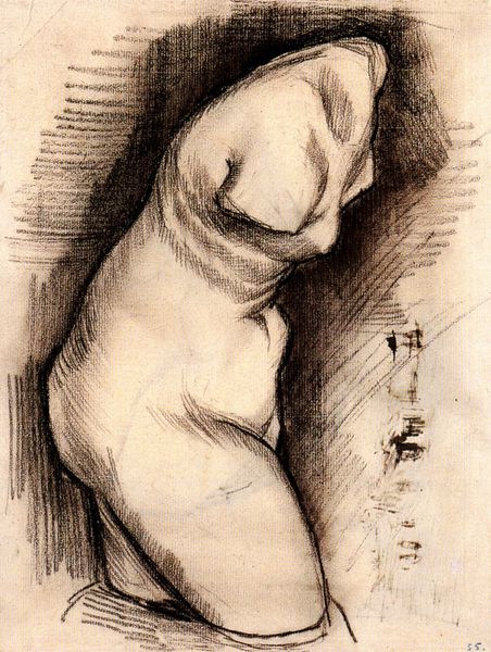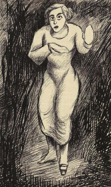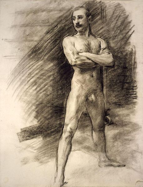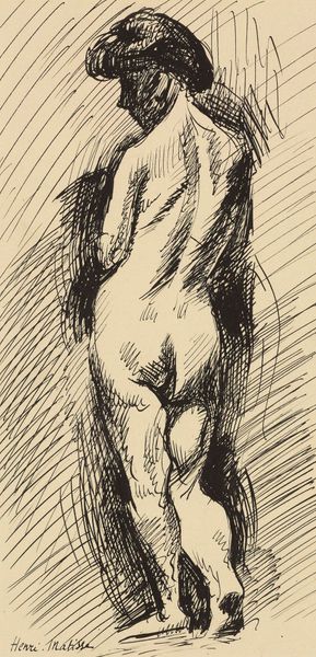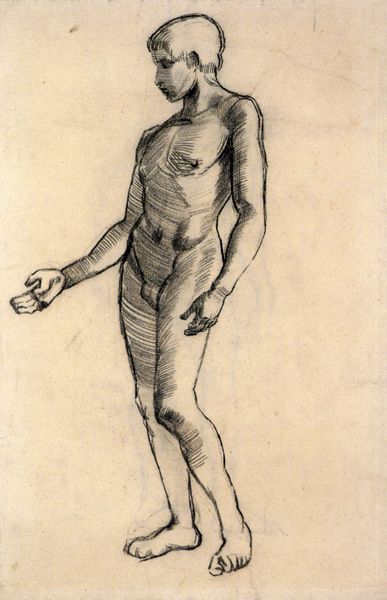 Editor: Here we have Vincent van Gogh's ink drawing, "Standing Male Nude Seen from the Front," created in 1886. It's quite stark and raw, wouldn't you say? What strikes me is the intense hatching that defines the figure's form, particularly the shadows. What do you make of this piece? Curator: It's interesting how you're drawn to the hatching. Considering Van Gogh's engagement with realism and Impressionism, this work provides insights into the art academies and the late 19th-century emphasis on understanding and portraying the human form. Nude studies were fundamental, you know? Think about what role that plays in the broader context of art history at this time. Editor: Right, the academic tradition. I guess I'm wondering about the contrast between that formal exercise and Van Gogh's later, more emotionally driven style. Was this study exhibited publicly back then? Curator: Likely not. Such academic drawings were mostly exercises for skill development, usually displayed within the atelier setting or assessed privately. Public displays of nudes were often very controlled, highly aestheticized to deflect criticism of "moral indecency." So the reception of this kind of drawing depends on the setting and socio-political considerations. Where do you think this image fits in that context? Editor: Good point. It feels very direct, unromanticized. The figure is simply *there*, and Van Gogh seems focused on mastering the technique, not idealizing the subject. It also seems very modern by breaking away from convention with each stroke! I wonder if he felt constricted by these conventions? Curator: Absolutely, and those very restrictions, the institutional pressure to conform while grappling with nascent modern ideals, surely shaped his path. Thank you, considering the environment this was created in gives greater context. Editor: Thanks! Looking at this work with an understanding of its social and artistic environment makes it a more valuable work for me!