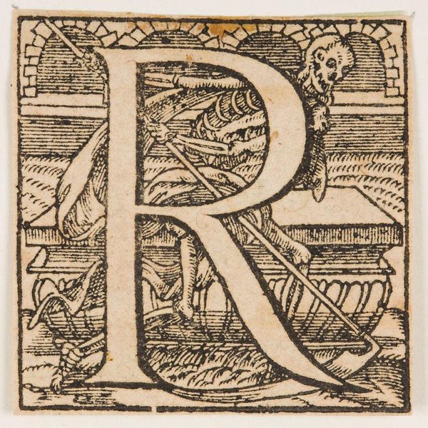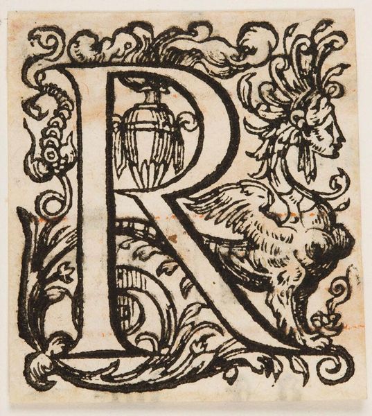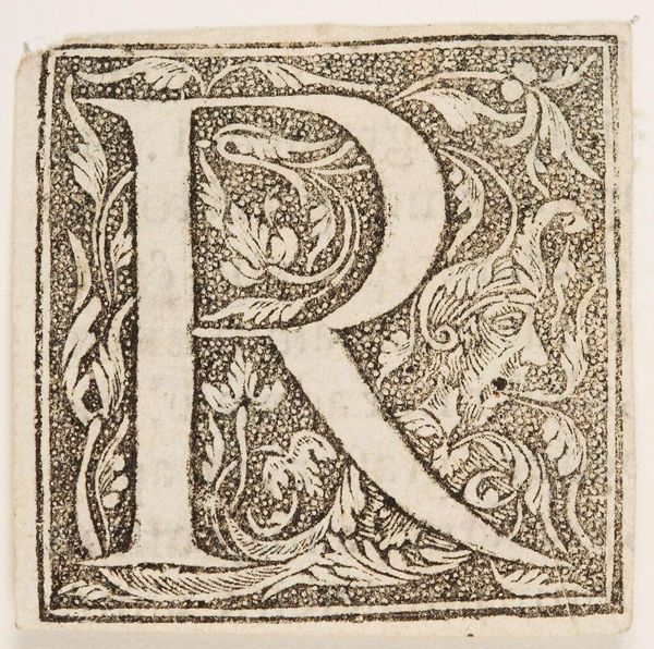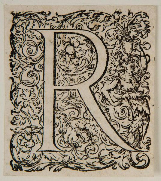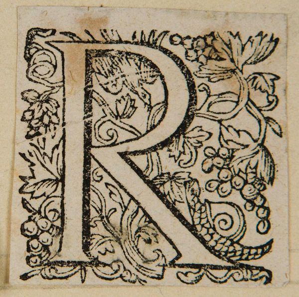 Curator: Immediately, I see constraint. Even within a space meant to celebrate form, that "R" feels trapped by the floral elements around it. Editor: Indeed. We're looking at an anonymous piece from the Harvard Art Museums simply titled "Letter R," and the graphic quality of the letterform itself is striking, isn't it? One imagines it’s a woodcut print of some kind. Curator: Absolutely. The floral motifs—the blossoms, the leaves—suggest a larger visual system. I'm struck by how the letter becomes a vessel, almost a sacred container, for natural symbolism. It feels like a hidden language. Editor: I read this "R" somewhat differently. I'm thinking about how this particular form might appear at the start of a word related to power—"regime," "rule," "rights"—and whether the floral elements soften or ironically comment on the rigidity of that power. Curator: Fascinating. It highlights how symbols evolve, acquiring new layers of meaning depending on historical and social contexts. Editor: Precisely. It's not just an "R"; it's a potential beginning, loaded with social implications. Curator: Thank you. I will now look at it with a different perspective.