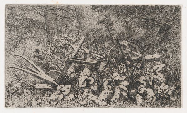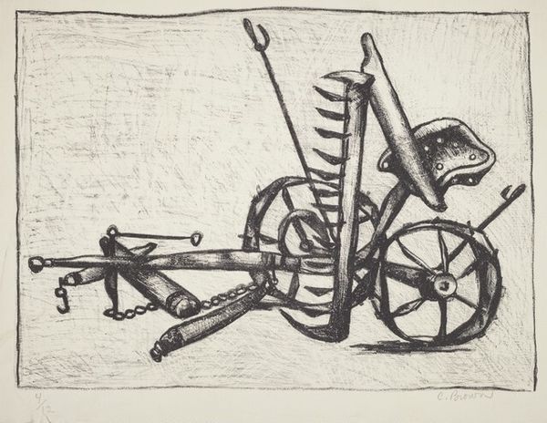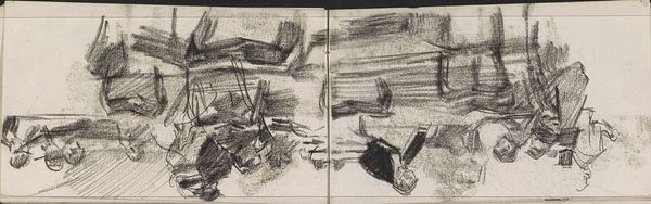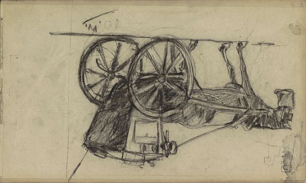 George Hendrik Breitner created this drawing, "Scharensliep aan het werk", with chalk, capturing a scene dominated by the stark contrast between light and shadow. The composition is almost entirely rendered in monochrome, creating an atmosphere that feels both immediate and timeless. Breitner’s use of chalk here, with its inherent textural qualities, echoes the industrial grit of the scene. The forms are built up through dense, layered strokes, adding depth and weight to the composition. The wheel, a central element, is depicted with a careful balance between definition and abstraction, its circularity a stark contrast to the more angular shapes surrounding it. This work challenges traditional notions of beauty, directing us instead to find aesthetic value in the everyday and the industrial. Breitner invites us to reconsider the boundaries of art. He destabilizes established categories, positioning the mundane as worthy of artistic exploration. His approach resonates with broader philosophical concerns about representation, perception, and the shifting values of a rapidly changing world.