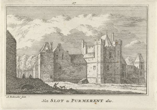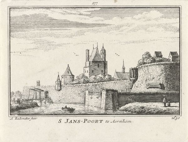 Abraham Rademaker created this etching, titled 'Gezicht op de IJsselpoort van Montfoort' or 'View of the IJsselpoort of Montfoort', in 1625. It offers us a glimpse into the historical and cultural landscape of the Netherlands during the early modern period. Notice how Rademaker captures the detailed architecture of the gate and the surrounding environment. This wasn't just about depicting a place; it reflected the Dutch Republic's pride in its infrastructure and territorial control, especially after the Eighty Years' War. What does it mean to represent power in this way? In the composition, everyday people go about their lives – fishing, walking, riding – set against the backdrop of a fortified gate. How does Rademaker subtly interweave the themes of security and daily life? It highlights the contrast between the need for protection and the continuity of everyday life. This piece reminds us to think about how we, too, navigate spaces shaped by power structures, and how these structures influence our personal experiences.