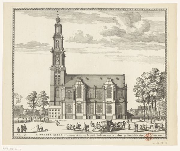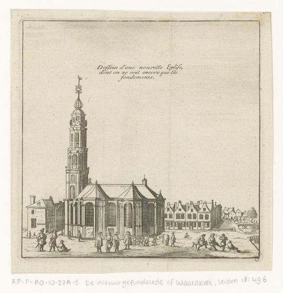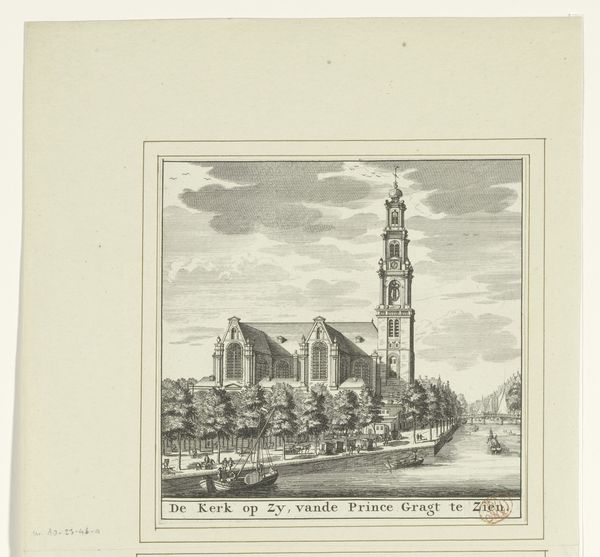 Christiaan Hagen created this print of the Nieuwe Oosterkerk church, likely around the turn of the 18th century. The composition immediately draws your eye upward, following the church’s tower as it soars into the cloud-filled sky. Hagen masterfully uses linear perspective to create depth, guiding your focus from the bustling foreground towards the horizon. Note how the architectural forms of the church contrast with the organic shapes of the clouds, creating a dynamic tension between the man-made and the natural world. This interplay can be seen through a structuralist lens as a representation of humanity's relationship with nature, reflecting the period's interest in harmonizing urban development with the environment. The print’s neat, framed border further emphasizes the structured view, positioning the scene as a carefully constructed representation. Hagen's detailed work invites ongoing interpretation, prompting us to consider how cultural values and philosophical ideas shape our perception and depiction of space.