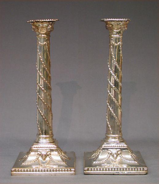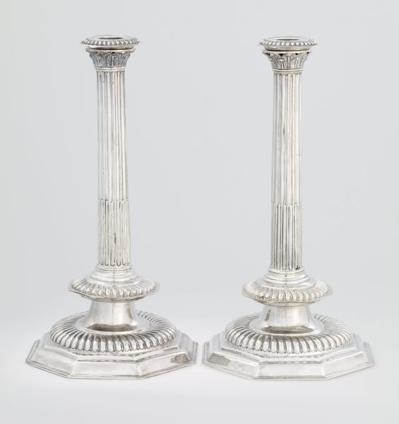 Editor: Here we have a pair of silver candlesticks created around 1771-72 by William Cox III, shimmering here on display. Their baroque style is immediately striking, and the metal work feels both incredibly ornate and quite imposing. What strikes you most about these pieces? Curator: It's funny you say imposing; I always thought they looked almost… fragile? The reflections, the intricate detail - like tiny stories etched in silver. And think about the light they held. Each flicker of the candle casting shadows that danced around these meticulously crafted objects. Editor: Stories in silver – I like that. So, given they are nearly 250 years old, what kind of 'story' are they trying to tell us? Curator: I imagine they have seen it all, quiet witnesses to grand feasts and intimate gatherings. Remember this was the height of Georgian England, where things had to reflect not just utility but also sophistication. Editor: Do you think they're more sculpture than functional object? Curator: That is a clever question. Both, of course! I like to imagine people of that era really appreciating design. Imagine the dedication and mastery needed to work with silver like this; this object definitely has artistic aspirations! I love thinking about what kinds of conversations unfolded under the candlelight these holders provided. It makes you wonder what voices and secrets they listened to. Editor: Exactly! So, it isn't only about the material; the candlesticks are like time capsules of history and memories. Thank you for sharing your thoughts! Curator: My pleasure! Thinking of everyday objects, and where they take you, is always such a joy.