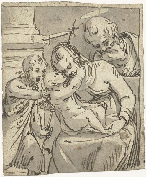 Curator: Here we have "Jongeman en twee meisjes," or "Young Man with Two Girls," a drawing by the Master of the Amsterdam Cabinet, dating from about 1478 to 1482. It’s rendered in ink, showcasing the artist’s skill in capturing intricate detail. Editor: It strikes me as incredibly intimate, almost melancholic. The way the three figures are intertwined and looking downwards... the image possesses an introspective mood, would you agree? Curator: Indeed. This image has been read in the context of courtly love, where melancholy was performative. While intimate in its grouping, it fits with Late Medieval dramatic representations of social ritual. The downward gazes are conventional, inviting viewers into the drama. Editor: You're right, that tracks. But those faces! They are very evocative, drawing upon some cultural memory, aren’t they? What’s with the rolled-up manuscript he's holding? It looks important, somehow. Curator: In the context of late medieval social scripts, the parchment would likely represent poetic expressions or verses used during courting. It allows the painter to signify the presence of learning. Editor: It’s interesting how the figures’ gestures communicate specific messages. The clothing too! Everyone in their finery would've resonated. This looks so natural yet must have followed established protocols of viewing figures and relationships, don't you think? Curator: Precisely. It reflects the conventions expected in artworks from that era, demonstrating and underscoring social status, but through this visual medium also instructing society as it progressed in many ways, too. The art played its part! Editor: Knowing some background shifts the understanding for sure. Before I saw this as rather romantic or mysterious and beautiful, now it’s intriguing in its historical function, to portray relationships. Thanks, it offers great food for thought! Curator: My pleasure. Understanding art through its cultural markers certainly gives it another depth. It makes you think about not just what they intended, but what the viewers might have also.