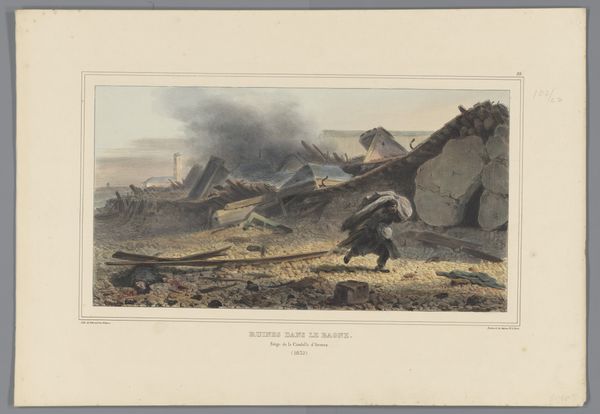 Curator: Here we have Auguste Raffet's "Bominslag op een ingegraven kanon, 1832," a drawing rendered in watercolor that captures a violent moment in military history. Editor: Boom! Chaos! That’s my first thought. A total visual disruption—that explosive energy radiating outwards, yet all this very muted color. It's strange; you feel the impact before you register the muted tones. Curator: Indeed. Note how Raffet employs both realism and romanticism to depict not just the event but its psychological impact. The buried cannon erupts, sending shrapnel skyward, while soldiers scramble for safety. Editor: They’re like little toy soldiers caught in a…well, in an actual explosion. There’s one sprawled on the ground –ouch! Raffet's managed to freeze this awful dance of survival. Did all this *really* happen? Was he even *there*? Curator: While details regarding the specific event depicted are scarce, the image aligns with the heightened emotionality typical of the Romantic period. Raffet utilizes strong diagonals and dynamic composition to pull us directly into the heart of the blast. The uniform and weapon tell of continuity. Editor: It's so interesting—the color palette—the grey, pale brown and light blue is reminiscent of those old war photos that have lost most of their colour; the desaturation feels authentic even for something made almost 200 years ago. Curator: Observe, too, the layers of meaning embedded within this work. The buried cannon suggests defense and entrenchment, while the explosion speaks to the futility of such measures. Man's struggle against man—a tale as old as time itself. The expressions of each soldier adds something of our time to the piece. Editor: There's this sense of, dare I say, theater, a bit exaggerated, I think. It's a play for our emotions more than an accurate historical account. It doesn't stop the drama! You have that blue coat to the right, someone aloof just turning around casually; very odd juxtaposition! Curator: A moment captured from the theatre of war! The artist plays his part expertly by portraying a terrible struggle but reminding his audience, by using color to denote memory, and shape to signify symbols, that war, then and now, destroys. Editor: In a way, the artist created not just a historical piece but an artwork of the everlasting imprint that these events leave in people's collective psyche. Now I look at that small-scale scene differently.
