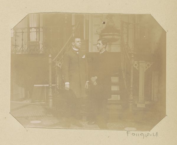 Curator: It feels like stumbling upon a secret, doesn't it? This early photograph emanates an aura of staged theatre, though I can't quite pinpoint if it's comedy or a brooding drama. Editor: Precisely. Here we have "Groepsportret van drie verklede mannen," which translates to "Group portrait of three men in costume." It was created sometime before 1894, by Hendrik Herman van den Berg. The presentation here is everything. Note how the poses convey their identities or aspirations, like visual short stories. Curator: The three figures remind me of characters in a Renaissance play. I find it intriguing that they are dressed in historical clothing, assuming a past identity or character. It taps into the allure of times gone by. Who might they be embodying through this costumery? What statements about present conditions can be understood by how these are understood by past references? Editor: Given the title inscribed below the photo as, "De Wiskunstenaars" or the "The Arithmeticians", this photograph is not likely associated with historical reenactments but instead a staged tableau with playful intent. Curator: Interesting! This suggests an intriguing social commentary from a scientific, rather than theatrical perspective. To our modern eye, it might seem incongruous, but consider what it means for figures of intellectual pursuits to choose baroque styling! Could it be seen as self-aware mockery or satire aimed towards contemporary conventions or perhaps a commentary on historical trends versus contemporary innovations? Editor: Absolutely. Costume was a way to establish cultural status, or even mock the powerful, providing the wearer and viewer with visual pleasure. While the clothing seems quite theatrical, that central figure looks far from courtly, lending itself to a critique of self-importance perhaps? Curator: Well, what I get is this image captures a fascinating convergence, reminding us of culture's cyclical nature where trends are continually re-imagined and reborn. These aren't mere costumes but vessels freighted with meaning. Editor: Indeed. Through this old photograph, Hendrik Herman van den Berg opens a doorway into a past world of sartorial display and possibly reveals its role as more than just visual fun.