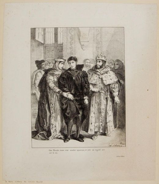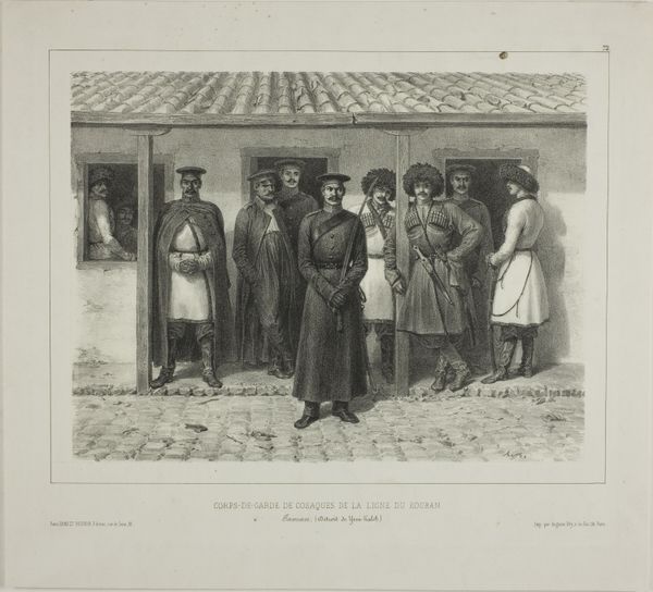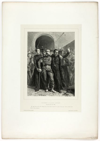 Curator: Auguste Raffet gifted us "Devotion of the Catholic Clergy," a work that really captures a poignant moment, doesn't it? Editor: It does. What hits me first is the sheer weight of it. The way the clergymen support this wounded soldier, it’s not just physical support, is it? Curator: Precisely, it speaks volumes about the Church's role during conflict, navigating moral complexities. They're guiding him through chaos toward some kind of sanctuary, maybe. Editor: Or a stage? I see an interesting contrast between the quiet devotion of the clergymen and the aggressive, weapon-wielding crowd behind them. Who is the audience here? Curator: The lithograph implicates all of us, perhaps. Raffet makes us consider the institutional relationship between the church, the military, and the civilian population. Editor: Well, "Devotion of the Catholic Clergy" has certainly given me a lot to think about; it highlights the eternal dance between power, faith, and human vulnerability. Curator: Indeed. Raffet leaves us pondering where true devotion lies, and how it manifests amidst the tumult of human conflict.