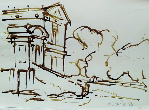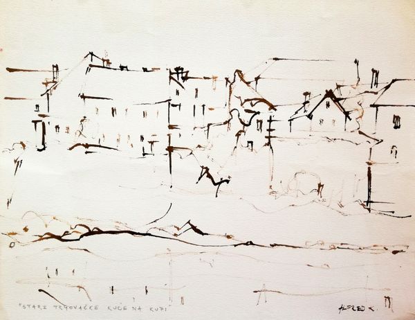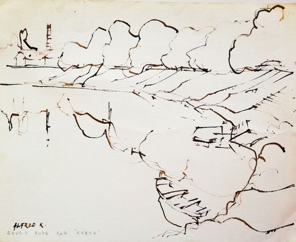 Curator: I’m drawn to the almost haunting stillness of this piece. Editor: I agree. I find myself captivated by Alfred Freddy Krupa's ink drawing, created in 2005. It's titled "The Old Slaughterhouse at Gaza in Karlovac," and subtitled "(The bank of the Kupa river)." Curator: "Slaughterhouse" – what an evocative word choice. Beyond its denotation, that term summons generations of shared meanings—a confluence of communal experience through which that word accrues emotional gravity. It’s quite apparent here, through the rapid, skeletal linework. It’s as if the essence of this building and the scene has been distilled through memory. Editor: Absolutely. Context is everything. It would be valuable to consider the social implications of that place, to unearth narratives and realities regarding labor, environmental impact, and cultural history in Karlovac during the 20th and early 21st century. Who benefitted, who was marginalized by such structures? Curator: It’s as if the location becomes a character itself within the narrative. Note how the ink bleeds slightly on the paper. Accidents become intentional as they imply a mutability of the form of the building itself, but simultaneously it calls forward its permanence as a place—a site of cultural memory that can then in turn be projected forward into the future as well. Editor: Indeed. And the minimalist modern style enhances this effect. What societal narratives have been traditionally left outside this "artful" construction? This is a space that might not seem obviously politically-charged, yet that sparseness demands consideration. Does this "beauty" preclude any recognition of prior historical brutalities carried out in slaughterhouses everywhere? Curator: Art certainly encourages engagement with difficult truths. Despite its grim name, it’s a surprisingly lyrical work. A lot of modernism in general operates this way, to engage with history—through and as the passage of time, like visual sediment that yields insights. Editor: Agreed, and that recognition can also provoke self-reflection on the viewer's part too, ideally moving towards a critical self-awareness about inherited perspectives. It does possess beauty and lightness in its strokes, which offers the potential to begin rather than end conversations. Curator: Yes, that visual lightness in execution invites layered considerations, to make something present from something past. Editor: It's made me really think. I think this drawing provides fertile ground for investigating art's relationship to difficult pasts.