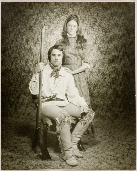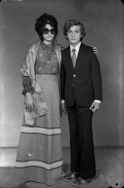 Editor: Here we have Akram Zaatari’s photograph of Hashem el Madani’s "Jradi (left) and a friend," taken in Lebanon in the early 1970s. It's such a striking image, very much of its time. What can you tell me about the cultural context surrounding this photograph? Curator: This image, and the larger collection it belongs to, really highlights the role of the studio photographer in shaping social identities. In 1970s Lebanon, these studios were vital spaces where people performed their desired selves for the camera. This image marks a shift from formal portraiture to a more relaxed, playful aesthetic, and how the public wanted to be portrayed. Editor: So, it was about constructing an image, a kind of personal branding? Curator: Exactly. It prompts us to consider how photography, even seemingly simple snapshots, participates in broader social and political narratives. It makes you wonder about the influence of western culture at the time, doesn’t it? Editor: Definitely, it is thought-provoking. Thank you. Curator: My pleasure.