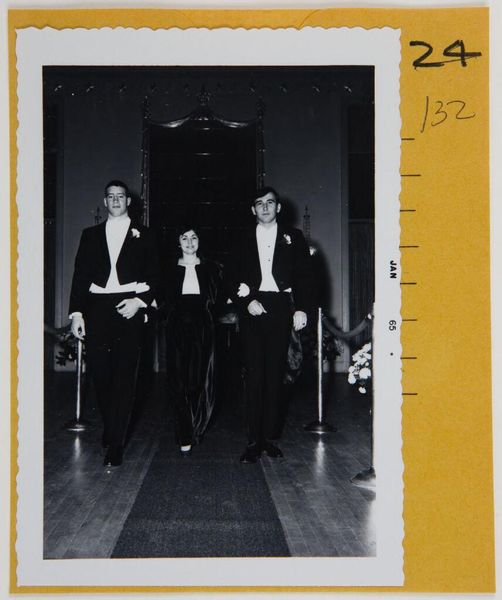 This work is one of a series of black and white silver gelatin photographs of varying sizes that are collectively titled Objects of study/The archive of studio Shehrazade/Hashem el Madani/Studio Practices. All of the photographs were taken by the Lebanese commercial photographer Hashem el Madani between 1948 and 1982 and compiled into the present group, 117 of which are in Tate’s collection, by the Lebanese artist Akram Zaatari. All of the photographs include people, either alone, in pairs or in small groups, and most were taken in Madani’s studio, although some were shot outside and in his subjects’ homes. The series features men and women and covers a wide age range from babies to elderly people. Almost all of the sitters assume poses deliberately for the camera, sometimes accompanied by props or costumes, and most gaze directly towards the lens. Many of the pictures show subjects interacting in various ways, including embracing, kissing and acting out scenes, such as a mock wrestling match. The photographs are mostly tightly cropped, with the sitter or sitters filling most of the frame, although in some cases the figures are positioned further away from the camera, for instance when shown sitting at a table or standing behind a chair. The photographs tend to have sparse backgrounds, often dominated by a blank posterior wall. They are mounted on white paper, displayed in plain white frames and signed on the back by Madani. Many of them have been organised into categories by Zaatari – such as a group featuring men dressed as Syrian resistance fighters and a collection depicting newly married couples – while the rest are presented individually. Zaatari has stated that although he prefers these groups to be displayed together, this is not a requirement (Akram Zaatari, email to Rachel Taylor, 24 April 2008, Tate Acquisition file).