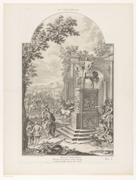 Nicolas de Beauvais created this print, "Figuren rond een allegorisch grafmonument voor Charles Sackville, zesde graaf van Dorset," sometime in the 18th century. The print depicts figures gathered around an elaborate, allegorical tomb for the British nobleman, Charles Sackville, the sixth Earl of Dorset. Made in France, this print reflects the neoclassical tastes that were fashionable at the time, drawing inspiration from ancient Greek and Roman art and architecture. The imagined setting is a romanticized landscape with classical ruins, referencing Sackville's status as an aristocrat and patron of the arts. This was the era of the Grand Tour, when aristocrats would travel around Europe, viewing classical art and architecture. What’s interesting here is the imagined monument to Sackville as a display of wealth and status. The print itself becomes a kind of commemorative object. Art historians might look at estate papers, inventories of artworks, and biographical materials to better understand Sackville's collecting habits and his relationship to contemporary artists. In this way, we can understand how art reinforced social hierarchies.