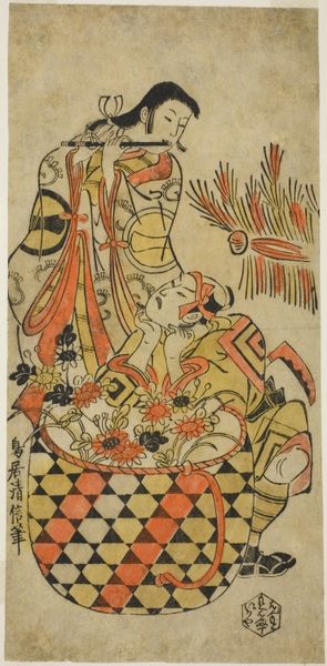 Torii Kiyonobu I created this woodblock print, "The Actor Iwai Sagenta I," during the Edo period, a time of economic growth, strict social order, and the flourishing of the arts in Japan. The print captures the likeness of Iwai Sagenta I, an actor celebrated for his onnagata roles, where men embody female characters. Through his art, Kiyonobu challenges traditional gender norms of the time by celebrating performers who blurred gender lines on stage. The print elevates the emotional intensity of the actor’s presence by use of line and color. The choice of subject reflects the cultural context of the era. Kabuki theater provided a space for exploring complex identities and social issues. Kiyonobu's work serves as a window into this world, capturing both the artistry and the social dynamics of his time.