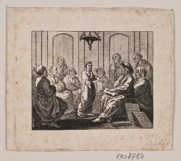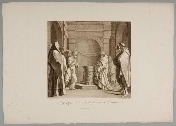 Curator: This print, "Herodias Receiving the Head of Saint John," comes to us from the hand of Conte Carlo Lasinio. The print captures a rather grim moment, wouldn't you agree? Editor: Indeed. It is stark. The composition, though balanced, feels heavy, with the looming architecture pressing down on the figures. There's an almost oppressive atmosphere here. It begs the question—how was it received by the public? Curator: Well, prints like these were often disseminated widely, allowing for accessibility beyond the elite. The social context is vital here; this image would have been interpreted through prevailing religious and moral frameworks. Consider the production: etching allowed for relative ease of reproduction. Editor: And, of course, images like these were frequently commissioned and used to reinforce the power dynamics of the time. Herodias herself, often depicted as a symbol of female cunning and cruelty, reflects societal anxieties about female authority. Curator: Precisely. The material—the print itself—facilitates the spread of these narratives. The labor involved in its creation, the distribution networks… it all contributes to the artwork's societal impact. Editor: Yes, but it's so interesting to consider how the narrative of power plays out in this image, and its public consumption. Curator: It's a somber piece and worth reflecting on its many facets. Editor: Absolutely, a stark reminder of the power of images to shape perceptions.
