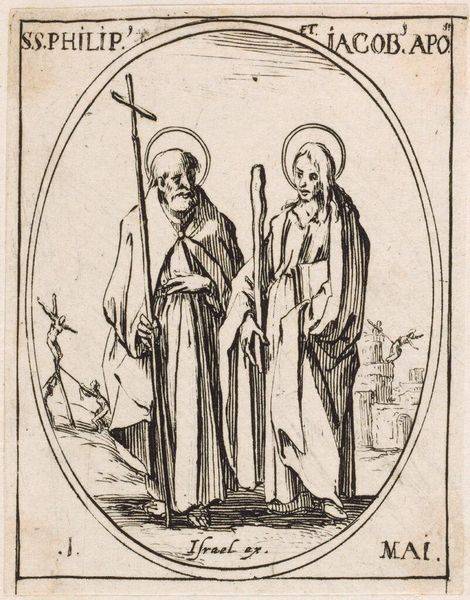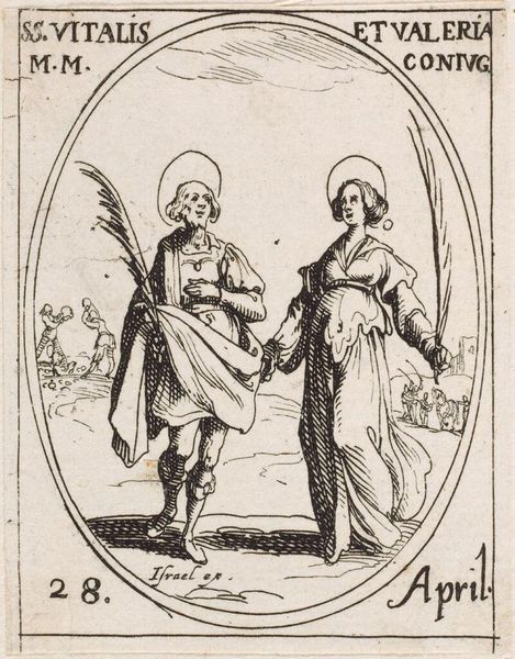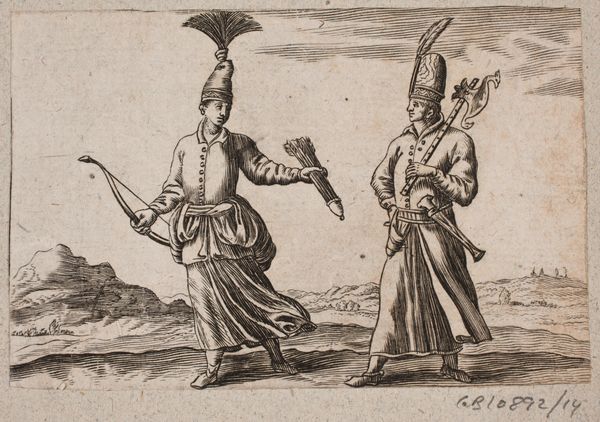 Curator: Jacques Callot's etching, "Two Turks with Feathered Turbans," presents a curious study in contrasts. Its dimensions are roughly 8.6 by 8.7 centimeters. Editor: They look so aloof and unintentionally comical—like they've just stepped out of a theatre production, all plumes and fine fabrics. Curator: Indeed, the precise etching technique creates a sharp delineation of form, emphasizing the texture of their garments and the flamboyant turbans. The meticulous line work, especially in the drapery, is remarkable. Editor: But their expressions, or lack thereof! It's like they're posing for a portrait, but forgot why. There is a whole crowd of people behind them! Curator: The composition invites analysis through the lens of semiotics, considering how the figures function as signs within a larger cultural context. The formal arrangement of the figures suggests a deliberate construction of meaning. Editor: It's funny how something so formally composed can feel so…absurd. Curator: Precisely. It reveals how art can simultaneously uphold and subvert established norms, creating a space for critical reflection. Editor: Well, I certainly won’t forget these two anytime soon. Curator: Nor I. A fascinating study in form and cultural representation.