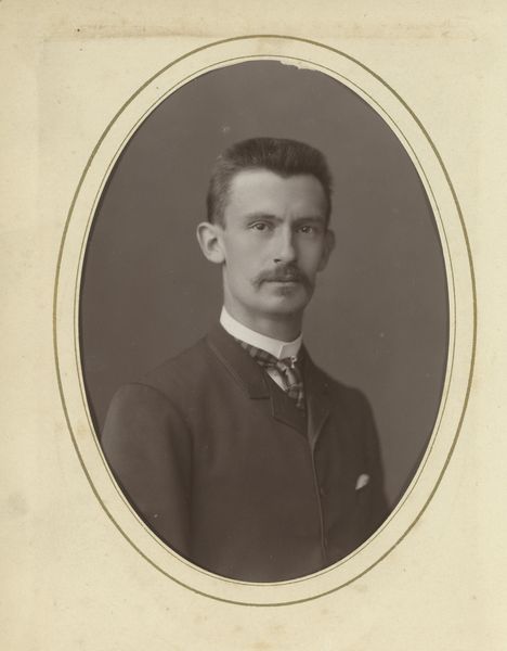Max Cosman captured this portrait of an unknown man using photographic paper, a medium that translates light and shadow into tones of gray. The subject's face, framed tightly, exudes a sense of reserved confidence. Consider the structural composition: the sharp lines of the suit contrast with the soft gradation of light that blurs the background, focusing our attention on the man's features. The moustache, meticulously groomed, acts as a strong horizontal element bisecting the face, drawing our eyes into an exploration of symmetry and balance. How does Cosman use the limitations of black and white photography to engage with broader ideas about representation? The absence of colour directs us to appreciate tonal variation, and how it models form and creates depth. This manipulation isn't merely aesthetic; it challenges fixed meanings and highlights new ways of thinking about perception and representation. Note how the formal elements of the image contribute to our understanding of cultural codes of the time. It’s a study in how subtle variations in light and shadow, shape and line, reflect and shape our perceptions.