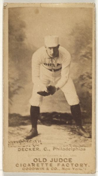 Curator: The portrait before us depicts Peter Jay "Pete" Sweeney, a 3rd baseman for the Washington Nationals, originating from the Old Judge series (N172) crafted for Old Judge Cigarettes in 1889. It resides within the collection of the Metropolitan Museum of Art. What are your initial thoughts? Editor: It has such a strangely muted tone, and it projects an intriguing blend of exhaustion and intense concentration. The tight crop gives me the feeling I'm crowding him. Curator: Interesting take. Let's delve into the making of the print. Goodwin & Company produced these images. Given its purpose as a cigarette card insert, mass production and material accessibility were prioritized. It is not "high art" but an ephemeral commodity meant for mass consumption. Editor: Exactly. And thinking about it historically, placing these cards inside cigarette packs was more than simple marketing. It capitalized on baseball's growing popularity, shaping the public image of athletes and using them to promote consumption habits and norms in the 19th century. Curator: Indeed. The photographic process and print medium afforded a degree of realism, further cementing its cultural relevance. What I appreciate about this piece is how it bridges commerce, photography, and burgeoning celebrity culture. We see here labor processes intimately connected with commercial outcomes. Editor: I see it too. This is also reflected in the way the card’s imagery promoted specific ideologies of sport as entertainment as much as it represented the individual player or team. Looking closer, you can also trace the influence of portraiture's history on the formal presentation here – posing, composition. That connection with established artistic traditions undoubtedly helped to elevate the status of these figures and the game itself. Curator: Precisely. Even the textual components below – "Old Judge Cigarette Factory, Goodwin & Co., New York” – underscore the industrial infrastructure propping up early baseball imagery. It gives me a more critical reading about the nature of spectatorship and commodity exchange. Editor: Considering its origins and audience gives even a simple promotional print added depth. Curator: Right. It underscores how interwoven art, marketing, and cultural trends are, challenging conventional artistic definitions.