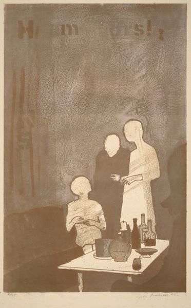 Curator: Kenneth Hartwell created this drawing, "Untitled (Self Portrait at the Barber Shop)" in 1932. It looks to be graphite and charcoal on paper. What are your initial thoughts on the piece? Editor: It feels like a slice of life, though an intensely shadowed and weighty one. The sheer density of objects and people crammed into the composition creates a slightly claustrophobic atmosphere. Curator: Absolutely. This work prompts reflection on masculinity, both its performance and the spaces where it's cultivated. Hartwell situates himself in this very codified social space, inviting a discourse around identity. Editor: Let's consider the context of barbershops during the early 20th century. They were crucial communal hubs, locations where men could network and share thoughts, influencing local politics and social bonds. This drawing reveals labor and social connection. Look at the detail in those grooming tools and bottles! Curator: I'm fascinated by the interplay between visibility and erasure here. Consider, for instance, the repetition of faces—are they echoes of Hartwell's anxieties, fragmented aspects of his persona struggling for representation in a rapidly changing society? The barber seemingly looming directly over Hartwell feels significant. Editor: Note also the materials: the stark black and white rendering adds to the feeling of being suspended in time, further emphasizing a link to both the production and performance of traditional values. It highlights how men constructed themselves and how this identity creation may be linked to consumer practices. Curator: Hartwell also places himself as the focal point. It is more than just about getting a haircut; the intimate portrayal and the reflective setting within a very traditionally masculine sphere may ask a viewer to reflect on what those spaces mean in relation to the politics of gender, especially when considered in the 1930s. Editor: Yes, the interplay between Hartwell's own self-awareness as an artist representing himself alongside the practical tools of barbering—scissors, brushes, and soaps—demonstrates the connection between art making and the working class. Curator: Viewing this artwork allows us to reflect on individual identities and how societal norms intersect. Editor: Indeed. Hartwell offers a moment captured, allowing a discourse about creation in labor, performance, and representation to unfold.