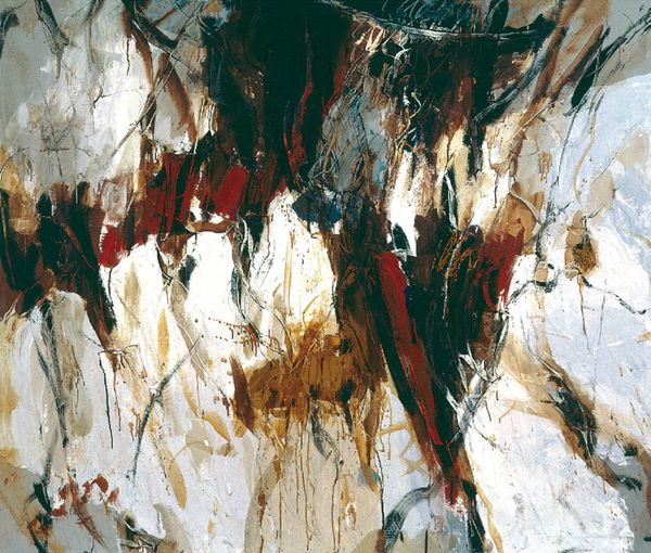 Curator: Thérèse Oulton's "Deposition," part of the Tate Collections, confronts us with a striking interplay of color and texture. Editor: It’s immediately arresting, isn't it? A visceral wash of blues and reds, almost like looking at a wound, a geological excavation, or perhaps the anatomy of power. Curator: Oulton emerged in a period where painting's relevance was being questioned. Her work engages directly with historical painting traditions, the sublime, and how those intersect with contemporary anxieties. Editor: The title, "Deposition," carries a weight, a specific art historical baggage relating to removal and loss, doesn't it? I see a conversation here about bodily autonomy, the historical exploitation of bodies, especially female bodies within artistic and social structures. Curator: Exactly. Her practice investigates the construction of historical narratives. Editor: I like how Oulton subverts those expectations, offering no clear narrative, just raw emotion and a space for viewers to project their own interpretations. Curator: It's an insightful and provocative commentary on history itself. Editor: Absolutely, a reminder of art's role in challenging established norms.