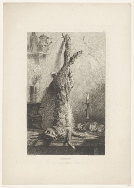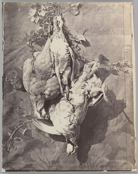 This evocative still life was produced by diverse makers, using photographic processes. Here, the materiality of photography confronts the raw reality of a rabbit, suspended upside down and presented against a hand-painted backdrop. This juxtaposition reveals much about 19th-century society, its relationship to the natural world, and the emerging industrial means of image production. The image captures a moment where older traditions of hunting and food preparation meet the industrialized world of photography. The softness of the rabbit's fur is rendered in stark contrast to the sharp focus of the lens. The print itself, with its sepia tones and tangible texture, becomes a testament to the craft involved in early photography. Considering the means of production helps us understand the photograph as more than a simple representation. It is a cultural artifact, reflecting a society grappling with changing relationships between nature, labor, and consumption. The photograph challenges the traditional distinctions between high art and the everyday.