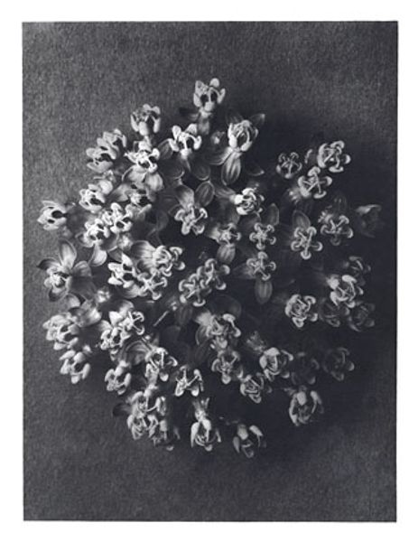 Editor: Here we have Karl Blossfeldt’s photogravure, "Achillea Millefolium (Milfoil)," created before 1928. I'm struck by the sheer density of the flowers, and the way the photogravure emphasizes texture. What do you see when you look at this piece? Curator: What immediately grabs my attention is the artist's choice of photogravure, a process involving labor-intensive etching and printing. It allowed Blossfeldt to disseminate these images widely, transforming the common milfoil into a commodity, an object for mass consumption and, dare I say, aesthetic contemplation. The serial nature of printmaking also raises questions about the artist's relationship to the subject – is he elevating the milfoil, or domesticating it for a bourgeois audience? Editor: That’s an interesting perspective. I was focused on the formal qualities, like the composition and the use of light. Curator: The composition *is* striking, but how does the medium itself influence our perception? Think about it: photography at the time was becoming increasingly accessible, intertwined with industrial processes. Blossfeldt’s choice isn’t simply about aesthetic preference. He's engaging with the very mechanics of representation and reproduction. How does the mechanization relate to his botanical subject matter? Editor: So, you're saying it’s not just about *what* he photographed, but *how* he chose to reproduce it. Almost as if the print itself becomes part of the subject. Curator: Exactly! And consider the social context: the early 20th century was a period of rapid industrialization. The milfoil, meticulously captured and reproduced, becomes a stand-in for larger questions about nature, industry, and the role of art in a rapidly changing world. What does it mean to make ‘art’ out of a repeatable industrial process? Editor: I never thought about it that way. It makes me consider the value we place on certain materials and processes over others. Curator: Indeed. It's a powerful reminder that art isn't created in a vacuum, but rather emerges from a complex interplay of materials, techniques, and socio-economic forces. Editor: I’ll definitely look at photogravures differently now. Thanks for the insight!