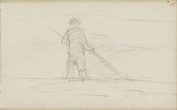 Jan Toorop made this drawing, 'Shellfish Fisherman with Net on the Beach at Katwijk aan Zee', using pencil on paper. The image shows a lone figure walking along a beach, his form rendered with delicate, almost tentative lines. Toorop's composition, while seemingly straightforward, subtly plays with the viewer's perception of space. The fisherman occupies the foreground, yet the background feels compressed, almost as if the sea and sky are pressing down on him. The lines are not just descriptive; they construct a semiotic field, where each stroke contributes to a larger narrative about labor, the human condition, and the environment. The fisherman becomes more than just a subject; he is a signifier, laden with meanings that transcend the pictorial space. Toorop destabilizes the conventional reading of landscape art. The drawing invites us to see beyond the surface, to decode the visual cues, and to engage with the complex interplay of representation and reality.
