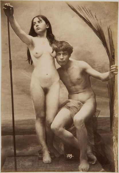Curator: What strikes me first about this photograph, "Thomas Eakins and John Laurie Wallace on a Beach" made around 1883, is the deliberate choice to photograph these figures from behind. It’s almost confrontational. Editor: I agree; the vulnerability is striking. It feels stark, unvarnished, a rejection of idealized forms prevalent at the time. A rather homoerotic undercurrent. Curator: Exactly. Eakins' interest was in realism, documenting the human form as it truly is, in its unadorned state. He wasn't afraid to challenge the Victorian era’s rather stringent social mores. The two figures appear anonymous; they are presented on this pebbled beach near their boat. Editor: He definitely pushed against prevailing notions of gender and the body. The image carries strong references to classical ideals of male friendship while also making it visually available. It invites speculation about their relationship beyond that of artist and model. Is there also an acknowledgement that male bodies and relationships exist and can also be made visually available? Curator: The symbolism here feels both naturalistic and highly considered. The positioning of the figures, the soft light, everything contributes to the impression of something…almost elemental. It’s about returning to a state of nature, a sort of pre-civilization freedom. Editor: While, yes, there is a connection with the return to the classical ideals, one must remember the complicated social and economic status underlying such gestures. Did Eakins fully consider whose bodies were available in this way to his camera lens, and why? His representations lack a racial or class intersectional element that makes me pause. Curator: A fair point, absolutely. Yet I still believe the photograph carries echoes of classical sculpture. Editor: Perhaps this points to how historical representation may be co-opted to very different ends, in ways neither beautiful nor productive. Curator: Yes, historical images force us to examine underlying motivations as we learn from visual memory and continuity. Editor: Which prompts crucial discussions about who gets to claim ownership of representation and visibility, then and now.