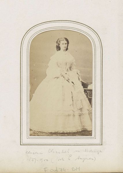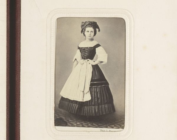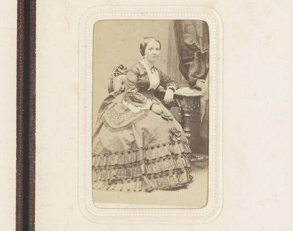 Editor: Here we have a gelatin-silver print, a portrait of a young woman standing next to a chair, created sometime between 1857 and 1864 by Louis Wegner. The dress really catches the eye, it’s so precisely patterned. What stands out to you? Curator: I'm drawn to the materiality of this piece. Look closely at the dress: those repeated stripes weren't simply decorative; they represent hours of labor, of weaving and stitching, potentially in harsh factory conditions. The dress becomes a marker of its time, indicative of the social structures embedded in the textile industry. Editor: So, you’re saying the material of her dress tells a story beyond just fashion? Curator: Absolutely. The rise of photography itself is a crucial element. Gelatin-silver prints democratized portraiture. How does this compare to painted portraits that were the reserve of the elite? Wegner's work, therefore, becomes less about the individual and more about the burgeoning accessibility afforded by industrialization and photographic technology. The availability of photography challenged the boundaries between craft and art and high and low. Editor: That's a completely different way of looking at it! So the labor of producing the photograph itself is also part of the artwork’s story. Curator: Precisely. Consider the photographer’s labour setting up the shot, preparing the chemicals. The final piece represents that collective effort. What impact do you think wider access to photographs had on self-perception at the time? Editor: I hadn't considered all those production layers. It highlights the huge shift that was happening with the rise of industrial production and how it impacted art and culture. Curator: Indeed. Looking at this image this way encourages us to question not just what we see, but how it came to be, and what forces enabled its creation. Editor: Thanks, that’s a very insightful way to understand the art.