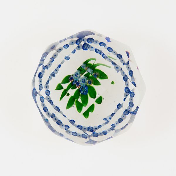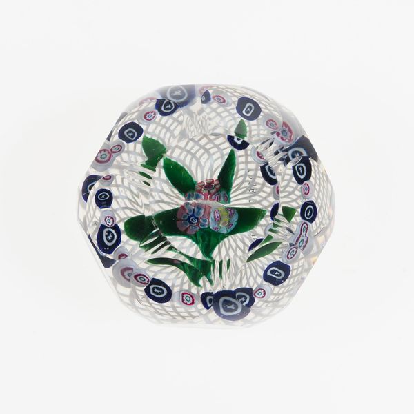 Editor: Here we have an intriguing little "Paperweight" from around the 19th century, made of glass, and it’s currently held at the Art Institute of Chicago. There's something almost unsettling about this still life captured in glass, it looks so fragile, like you could shatter it. How would you interpret this work? Curator: I see it as a reflection of the evolving socio-economic landscape of the 19th century. Paperweights, especially those crafted with such detail, became increasingly popular as symbols of status and taste within the burgeoning middle class. Think about how the Industrial Revolution fostered both mass production and artisanal craftsmanship. This piece encapsulates both – it’s an object for the desk, yet also an item of display and luxury. Why do you think fruit and foliage were chosen for its central motif? Editor: Perhaps to signal prosperity and natural bounty, common themes in art meant to express comfort and wealth? I see the grapes now... are they intended to symbolize something more specific, perhaps referencing classical motifs? Curator: Indeed, grapes have long carried connotations beyond mere prosperity. Consider their use in art history, frequently linked to Dionysus or Bacchus and ideas of fertility, festivity, and even sacrifice. Placing these symbolic clusters within the controlled, manufactured environment of a glass paperweight subtly manipulates this iconography. The natural is being harnessed, stylized and constrained for domestic consumption, revealing attitudes towards the role and presentation of nature itself. Is this something that resonates with you when observing this paperweight? Editor: I never considered that juxtaposition of natural symbolism with manufactured art. It’s almost like a tiny encapsulated world, reflecting broader cultural themes. That has given me a whole new appreciation for something that I otherwise dismissed as being of modest value. Curator: Exactly! Its value lies in how it can be read through a larger cultural and historical lens. Appreciating how seemingly mundane objects embody rich, complex narratives about our history is, I think, a skill every art lover should cultivate.