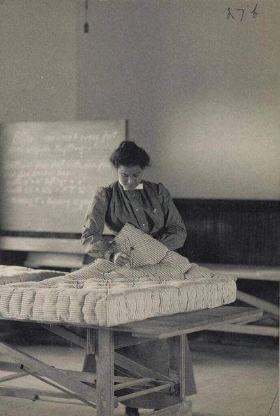 Curator: Frances Benjamin Johnston’s photograph, part of a series on the Hampton Normal and Industrial School, shows a young woman scrubbing a table. The image aims to depict domestic science training for Negro girls. Editor: The somber lighting and the young woman’s downcast eyes create a melancholy mood, despite the ostensibly industrious subject. Curator: This image, and the series it belongs to, functions as a visual document of the Hampton Institute’s mission, which was to assimilate African Americans through vocational training. We can see the physical labor embedded in the image; the table, the cloth, the young woman’s posture. Editor: And it’s crucial to remember how this labor was contextualized within a broader system of racial and social control. The image’s display and circulation were instrumental in shaping public perceptions of African Americans. Curator: Johnston's photographic process itself—the choice of lighting, composition, and the very act of capturing this scene—reveals the complicated power dynamics at play. Editor: Absolutely. It forces us to consider the role of photography in shaping narratives around race, labor, and education during that era. Curator: Examining the image has really highlighted how intertwined labor, representation, and assimilation were. Editor: Yes, and how crucial it is to critically assess the historical context in which images like these were produced and consumed.