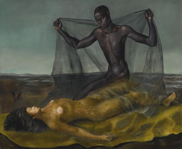 Editor: This oil painting is Harmonia Rosales's "Birth of Oshun," created in 2017. I'm immediately struck by its resemblance to Botticelli's "Birth of Venus," but with Black figures. What do you make of Rosales reimagining this iconic scene? Curator: Rosales directly challenges the Eurocentric ideals that have historically dominated art. By appropriating "The Birth of Venus," she interrogates the exclusion of Black bodies from classical narratives. Consider how the original painting, commissioned by the Medici family, reinforced their power and status. Rosales disrupts this legacy by placing Oshun, the Yoruba goddess of love, beauty, and fertility, at the center. Editor: So, it’s not just about representation, but also about questioning the power structures behind art history? Curator: Precisely. The peacock feathers held by the Zephyr figures, for instance, aren’t merely decorative. Peacocks symbolize beauty and pride, yet their appropriation often carries a colonial weight. What happens when we view them here? Rosales prompts us to rethink the established canon, its inherent biases, and its continuing impact on cultural perception. Editor: I never thought about it that way. It really makes you think about who gets to be represented, and why. Curator: Rosales highlights that museums and galleries play a significant role in shaping cultural understanding. By exhibiting works like "Birth of Oshun," these institutions are participating in a crucial dialogue about inclusivity and representation. Do you think simply replacing white figures with Black figures is enough, or does it demand a more radical shift? Editor: I think it's a powerful start that opens up more avenues to explore. Curator: Agreed. It’s a conversation starter that has the potential to disrupt ingrained ideas of beauty and cultural importance. Editor: I'm definitely leaving with a new perspective on how art reflects and shapes society. Curator: Indeed, and how artists like Rosales are using that very dynamic to drive meaningful change.