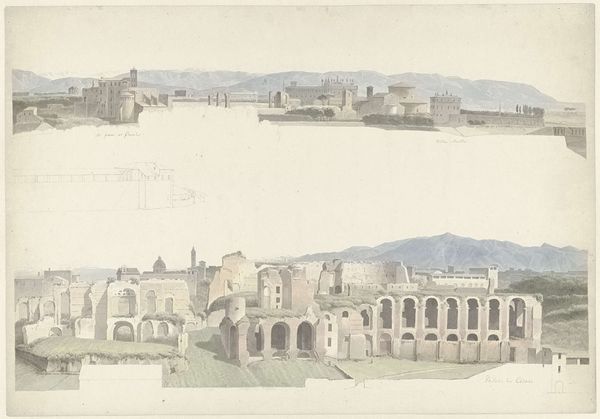 Editor: This watercolor on paper, “Blick auf SS. Giovanni e Paolo in Rom” by Friedrich Olivier, presents a hazy cityscape. The ruins are romantic, but I feel somewhat detached from the scene due to the muted colors. What do you see in this piece? Curator: The choice of depicting a decaying, yet still imposing, architectural site like SS. Giovanni e Paolo in Rome places it firmly within the Romantic movement's interest in history, ruins, and the power of the past. How do you think presenting ruins as a subject contributed to the social and political thinking of the time? Editor: Well, I guess ruins would have made people think about the rise and fall of empires and the fleeting nature of power. Seeing the grandeur of the past juxtaposed with its current state of decay creates a sense of melancholy. Curator: Precisely. Olivier’s subtle rendering, in watercolor, makes it seem as though time and weather has gently eroded this cityscape. This image could represent the church being diminished by forces outside itself. Now, let’s also consider the gaze, who has the luxury of regarding such a famous building with this level of disinterest and calm? What socio-political status could that represent at this period in time? Editor: Hmm, I hadn't thought about the point of view that much. Perhaps the artist, or those who commissioned works like this, wanted to demonstrate their place above the fray. Viewing history, but not caught within it? Curator: Precisely! They are elevated and apart. By understanding its cultural and historical underpinnings, the melancholy landscape moves toward active participation in a societal hierarchy. Editor: It's interesting how contextualizing the painting really shifts the mood of it for me. I’ll keep that in mind as I’m trying to get my history degree. Curator: I'm glad I could share a new viewpoint to reflect upon. Looking at this piece has been insightful.