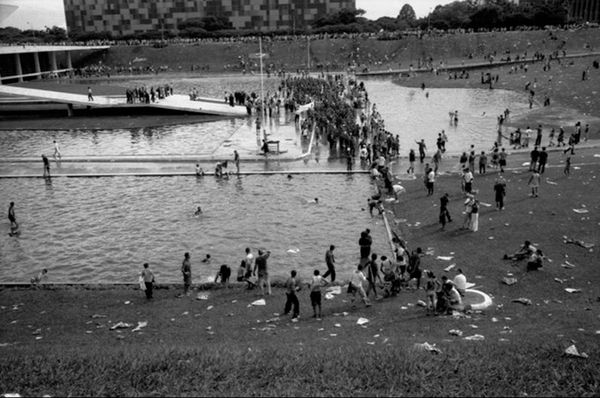 Editor: Here we have Mauro Restiffe's "Empossamento #7." This black and white photograph captures a massive crowd, and there's almost a sense of chaotic energy in the scene. What strikes you most about this work? Curator: Well, first, the title, "Empossamento," meaning inauguration or swearing-in, hints at a pivotal moment. For me, it whispers of collective hope, yet the monochrome palette adds a layer of solemnity, almost like a memory. It’s as if the joy is tempered with a sense of history's weight, don’t you think? Editor: I do. The contrast definitely gives it a documentary feel. Thanks for sharing your perspective! Curator: My pleasure! It's fascinating how a single image can hold so many potential narratives, isn't it?