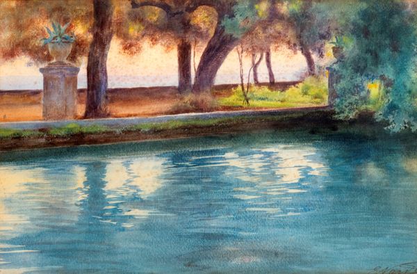 Editor: Here we have Bernadette Resha's watercolor, "The Calm," created in 2009. It's a very serene landscape. What I notice most is the soft, diffused light and how it contributes to a feeling of quietude. How do you interpret this work? Curator: Thanks. I think your initial read is insightful. For me, "The Calm" resonates deeply with ideas about environmental consciousness and the importance of representing landscapes not merely as pretty vistas, but as spaces imbued with histories of use and potential misuse. How might Resha's work speak to current discussions about ecological preservation and environmental justice? Editor: That's a great point. I was just thinking about the idea of 'calm' in the context of climate change and eco-anxiety; it's almost unsettling, this peacefulness. Curator: Precisely! Isn't it interesting to consider how notions of "calm" or "peace" have historically been associated with idyllic landscapes, often obscuring the social and ecological dynamics at play? Who has access to this calm, and at what cost? Do you think Resha is intentionally commenting on those inequalities or bringing a broader cultural critique into focus? Editor: It makes me wonder if this 'calm' is a fragile state, or if Resha's documenting a specific landscape being threatened somehow. Perhaps I’m projecting, but there’s an uneasy tension here. Curator: That tension is powerful! And perhaps indicative of how art can act as a subtle form of activism, urging viewers to consider the deeper political and social implications embedded within seemingly tranquil scenes. Has looking through that lens shifted your thinking about landscape art more broadly? Editor: Definitely. I’ll never see a peaceful landscape painting the same way again! Curator: Nor will I!