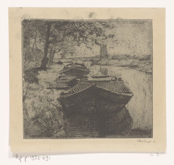 Editor: This is Pieter Dupont’s etching, "Brug in de Baarsjes," from 1895. It's a lovely, understated piece, this rendering of a simple bridge and windmill using such a delicate medium. What strikes you when you look at this work? Curator: What I find most interesting is how Dupont uses realism to depict an ordinary scene, almost elevating the everyday. This was a period where art academies wielded significant influence, setting standards and expectations. How might an etching like this, of such a common subject, have been perceived then? Editor: I imagine it might have been seen as a bit radical, maybe even subversive. An artist focusing on the mundane instead of the grand narratives of history or mythology... Curator: Precisely! It challenges the prevailing academic hierarchies. Furthermore, the choice of printmaking makes this image widely accessible; what do you think that says about the artist's intent? Was it only an exercise of observation and capture of a moment? Or was there a stronger vision? Editor: I wonder if he wanted to democratize art by depicting common sights for a wider audience. Maybe it’s a statement about finding beauty in simplicity? Curator: It is fascinating to imagine how Dupont's artwork speaks volumes about the changing social landscape of the time. Artists began questioning established norms, seeking to represent a more democratic and truthful depiction of life as it was. Editor: I hadn't thought about the social context in quite that way. It is eye-opening how this seemingly simple landscape can have such broader implications when considering the history behind it. Curator: Exactly. Seeing art in the light of history can change your perception of everything!