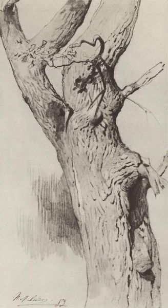 Curator: Looking at this intriguing sketch, dating from 1910 and attributed to Ivan Bilibin. It's entitled, simply, "Drawing from the album." Editor: My first impression is one of quiet strength. The stark lines and monochrome palette give the tree a real sense of aged endurance. It feels almost like a portrait of resilience. Curator: Bilibin's masterful use of line is evident. Observe the varied densities – some lines are firm and resolute, defining the outer form of the tree, whilst others are delicate and broken, giving texture to the bark. The composition itself is quite interesting; the twisting form directs our eye upwards. Editor: I agree. The upward sweep reminds me of the tree of life archetype, deeply embedded in folklore and mythology. This skeletal form also invokes themes of decay and rebirth, ideas found in so many mythologies from different cultures. Curator: Notice also the precision. He meticulously renders each convolution and crevice, and captures how light interacts with its subject with remarkable accuracy. There’s a semiotic layering at play where his stylistic choices invite our interpretation. Editor: It does provoke questions about what this tree represents. Given Bilibin's involvement in illustrating fairy tales and folklore, perhaps it's a guardian of a sacred space, or a marker for a transformative journey, it certainly exudes presence and hints at hidden stories. Curator: While those symbolic readings are indeed plausible, the strength of the work, for me, remains in its inherent structure and the dynamic tension within. It’s about the relationships of lines, how space is activated, and how this material form comes alive. Editor: Yes, well for me it evokes echoes of ancient woods, of a world filled with symbolic meaning just waiting to be revealed. An enigmatic piece overall, though, isn't it? Curator: Indeed. Its formal qualities open a door for different perspectives, all of which converge, perhaps, on the undeniable evocative force.