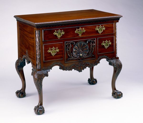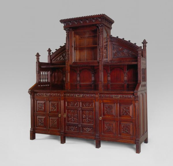 This medal cabinet was created by George Bullock in the early 19th century. Its symmetrical structure and warm wood tones invite closer inspection. Notice how the rectilinear form of the cabinet is softened by the arched top and rounded details. The eye is drawn to the contrasting patterns of the wood grain against the stylized floral inlays. These decorative motifs, arranged in vertical panels and horizontal bands, enhance the cabinet's structured appearance. The cabinet embodies the early 19th-century fascination with classical forms, blended with the rich textures of natural materials. The piece destabilizes the boundary between functional object and ornate design. The cabinet, as a container of precious objects, becomes an object of aesthetic appreciation. The choice of natural materials, such as wood, and the structured approach to decoration elevate our perception.