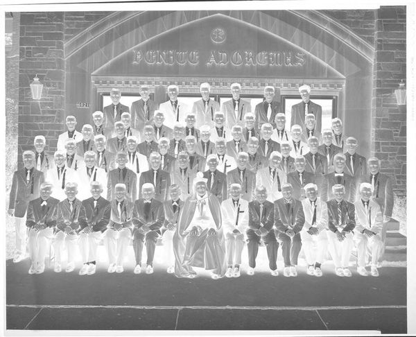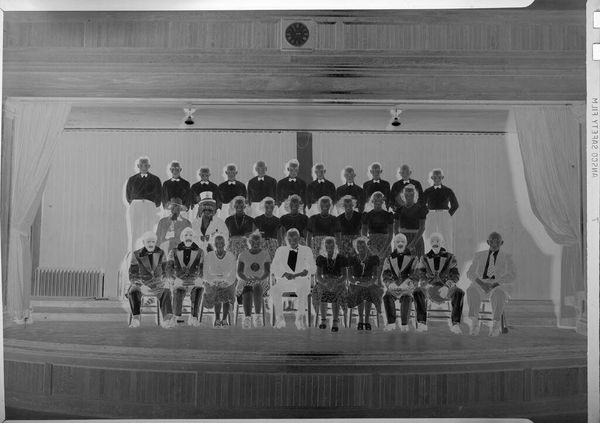 Curator: This is an untitled photograph by John Deusing, residing in the Harvard Art Museums. It measures about 20 by 25 centimeters. Editor: At first glance, it's a bit eerie, like a ghostly gathering. I'm getting a strong sense of formality, but also a slightly unsettling, otherworldly vibe. Curator: Note the rigid symmetry and the repetition of figures. Deusing has carefully constructed the composition to emphasize the group's collective identity, a unified, yet anonymous whole. Editor: That uniformity is almost suffocating. Is it me, or is there a hint of defiance in some of those eyes? Like they're kids playing dress-up but secretly plotting rebellion. Curator: The reversed tonality challenges our perception of light and shadow, complicating the narrative. It invites a deeper reading into the symbolic weight of these figures. Editor: Right, it's like looking at the world through a negative, a mirror image of expectations. Makes you wonder what's really going on beneath the surface. Curator: Exactly. Deusing's work prompts questions rather than providing answers, doesn't it? Editor: It certainly does. I'm walking away with more questions than I came in with. Intriguing!