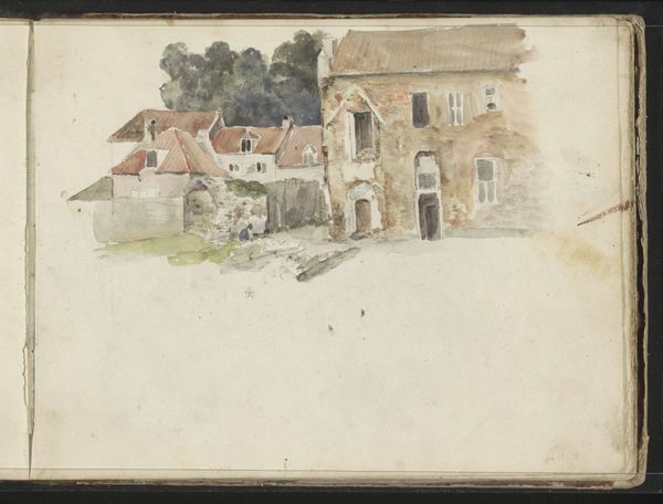 This is 'Cityscape from a Window', a watercolour work by Reinier Craeyvanger, held at the Rijksmuseum. The painting presents a view dominated by a building's facade, rendered in muted reds and greys, juxtaposed against the organic green of trees and the open expanse of a clouded sky. Craeyvanger uses the architectural forms to explore a structured perspective, employing a semiotic language where windows and rooftops become signs of urban life. The interplay of geometric shapes and natural forms reflects a tension between the constructed and the organic. The composition is seemingly casual but carefully structured, drawing the eye across different planes and textures. Consider how Craeyvanger manipulates our perception. He sets up a visual dialogue between the exterior and interior spaces, questioning traditional landscape painting, while also subtly reflecting on the viewer's position as an observer within a constructed environment.