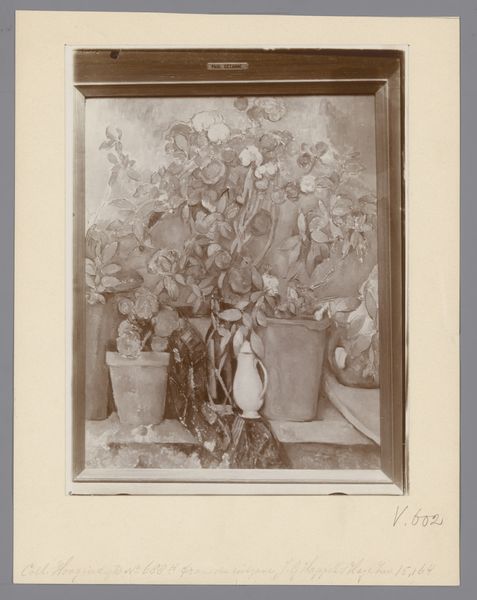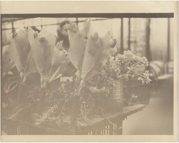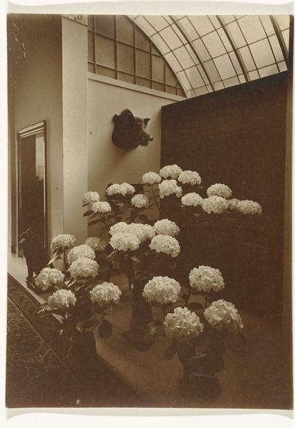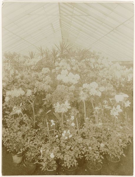 Editor: This photograph, taken by Richard Tepe between 1900 and 1930, is titled 'Flowering Plants in a Greenhouse.' It's a beautiful, somewhat hazy image. What stands out to me is how it captures the controlled yet wild nature of the greenhouse, a space both natural and artificial. How do you interpret this work? Curator: It's an intriguing piece, isn't it? When I look at this photograph, I'm struck by the historical and social implications embedded within what seems like a simple depiction of plants. Consider the context: late 19th, early 20th century. The rise of industrialization allowed for structures like greenhouses, creating environments detached from local climates, effectively allowing for a control over nature itself. What does it mean to cultivate a space like this during a time of shifting social landscapes and evolving class structures? Editor: So, it’s about more than just pretty flowers? Curator: Precisely. Greenhouses often represented wealth and leisure, a controlled Eden accessible primarily to the privileged. Tepe’s choice to document this space invites questions about access, power dynamics, and the very act of manipulating the natural world for aesthetic and material gain. Does the monochromatic nature of the photograph amplify or subdue those implications, do you think? Editor: That makes me consider how photography itself, especially then, allowed for documenting and controlling images, somewhat similar to how the greenhouse controls the plants inside. I see that the impressionistic and realistic styles converge to reveal power dynamics that are both visible and obscured by aesthetic beauty. Curator: Indeed. By considering photography within historical and social currents, we reveal the intersectional narratives hidden beneath layers of aesthetic appreciation. Editor: I'll definitely view greenhouses—and photographs—differently now! Thank you for sharing your insights. Curator: It's a pleasure! Every artwork is a door, and our job is to explore the historical, cultural and social contexts waiting behind it.