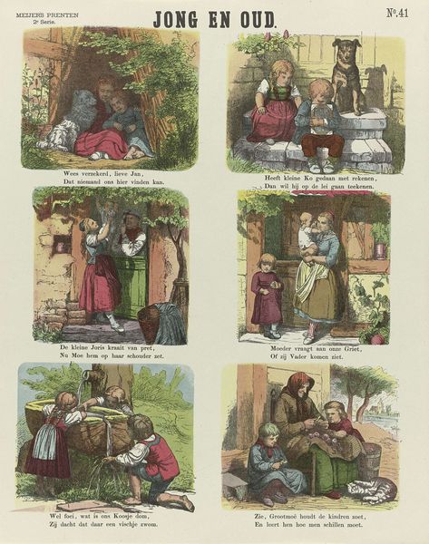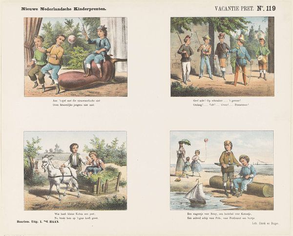 Editor: This is "In het woud en op het veld," or "In the woods and in the field," created in 1874 by De Ruyter & Meijer. It looks like a watercolor print with several little scenes showing children playing. I get a really sweet, old-fashioned vibe from it. What’s your take? What details jump out at you? Art Historian: Oh, I adore these glimpses into childhoods of long ago! It's like peeking through a time portal, isn’t it? I'm drawn to the folksy feel, it almost resembles a page from a cherished fairytale book, each illustration a little poem. Did they hand-paint each one, or was it more of a print run, like stamps? I love how quaintly busy it is with a child doing what? Playing in the river or fields with all of their animal friends. What feelings are we really viewing, don’t you think? Editor: I’d guess it’s a print – they probably made multiple copies. But yeah, it feels so homey and simple. Like, imagine being one of those kids just hanging out by the water! This definitely embodies nostalgia and the simple, but enjoyable feelings that evoke such happiness. Art Historian: Exactly. Think about the world in 1874. What would a colorful print like this mean? Was it supposed to show the daily happenings? What’s particularly enchanting to me is that each child is experiencing pure happiness through these whimsical scenes. Does this trigger similar moments for you as well? I have childhood memories running like film stills through my head now. Editor: Definitely! It reminds me of flipping through old storybooks at my grandma's house. I never really considered the impact images like this might have had "back then" Art Historian: See! Art does that, it shrinks time, links souls. This quaint picture becomes more than art, wouldn’t you agree? I learned that prints used to serve more of a cultural impact and they now make nostalgic paintings come to life. Editor: Absolutely, I see what you mean. The world could use that kind of simple magic and cultural meaning today.