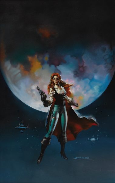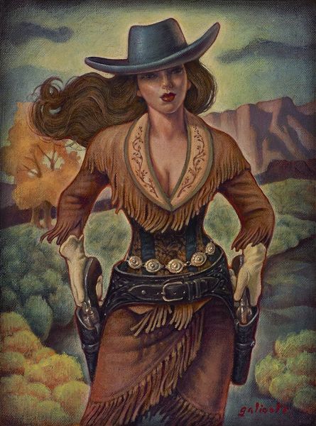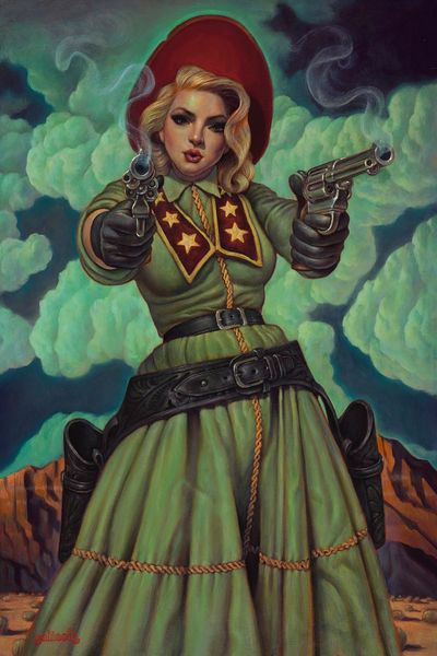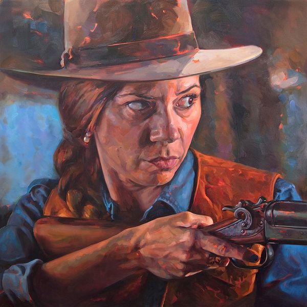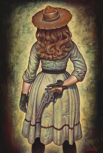 Curator: Felice House's 2014 oil painting, "Virginia Banderas in Desperado," certainly grabs your attention. It's quite a compelling image, isn’t it? What are your initial impressions? Editor: Definitely. The mood is heavy, almost mournful. There's a vulnerability in the woman’s face that conflicts with the revolvers she holds. The composition directs the viewer's eyes upward towards her face, which has this haunting quality about it. Curator: It’s fascinating how House utilizes oil paint here. The materiality gives a richness and depth that resonates with the work's emotional texture. You can see the deliberate brushstrokes and how they contribute to the figure's construction but it feels very direct and approachable, accessible. Editor: Absolutely, the "Desperado" iconography is hard to miss – guns blazing, but with this modern gaze, it turns the expected wild west representation into something much deeper, especially with that name...it connects immediately to that cultural mythology of heroism and loneliness. There's almost this echo of vulnerability behind the gaze of the female subject that creates an intriguing conversation about gender roles and heroism. Curator: Yes, looking at the labor that goes into each stroke and also the artistic labor of sourcing the reference… This series, *Re-Westerning*, directly tackles the whitewashed and masculine narratives inherent in Western genre painting. House is very explicitly positioning women within these narratives. Consider also how our consumption of those narratives might evolve alongside shifting gender roles, and ideas surrounding work and performance of character in the American west. Editor: That’s right. By placing women in traditionally male roles within the Western genre, the artist calls into question existing iconographic portrayals within that genre and how societal assumptions are passed down to modern women through symbolism. We now can view familiar concepts like "strength" or "justice" through a far more personal lens as opposed to societal archetypes which have already been ingrained throughout culture from the moment we begin observing images. Curator: I'm thinking about the broader impact of the material presentation: The piece presents both realism and a certain distance – it creates accessibility to engage with, even potentially revise, the symbols. Editor: It definitely invites reflection. We come to this image expecting a familiar heroic, confident character from the American West and we get a complex range of emotions instead, along with an echo of this archetype we expect. Curator: Food for thought on the materials and social framework with which we approach historical contexts! Editor: A great example of the ways iconography challenges our cultural memory and social conventions, inviting reflection, which leads to deeper insights!