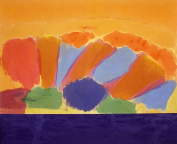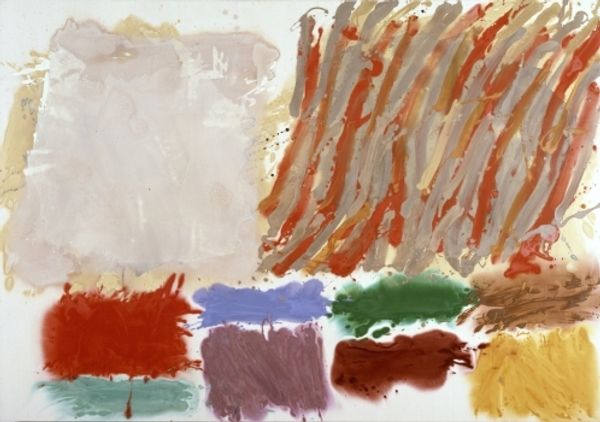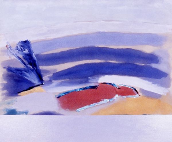Ronnie Landfield made this painting, Village In The Moon, with what looks like big brushes and maybe watered-down acrylic or gouache. The colours are laid down in these juicy, transparent strokes, like he's building up the landscape with pure pigment. It's all about the gesture. I love the way the strokes build up this abstract landscape. Look at that horizontal band of red, how it bleeds into the blue beneath it. Or the way he's dragged the brush, leaving these little gaps, like glimpses of what's underneath. It's so simple and direct, yet there's a real sense of depth and atmosphere. The painting is a process of laying colour upon colour. It reminds me a bit of Milton Avery, that same love of colour and simplified forms, but Landfield's got this raw, almost punk energy that's all his own. He shows us that painting doesn't have to be about perfection, it can be about the sheer joy of making marks and seeing what happens.