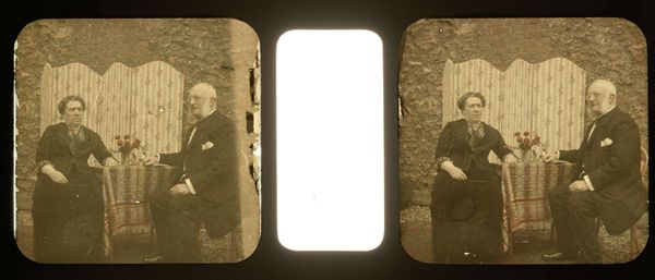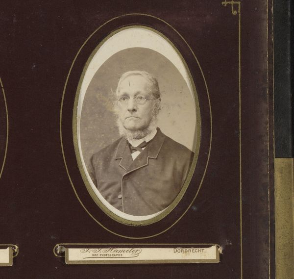 Curator: Before us is “Portret van Arthur Kennedy,” an albumen print portrait created by Foster & Martin before 1881. Editor: There's something hauntingly serene about this portrait; a stillness captured in sepia tones, and a quiet elegance to the man in the picture, like a study in Victorian gravitas. The photograph itself seems mounted within a book—a physical artifact adding to the experience. Curator: Indeed. Given the timing, we might read this as situated within the Victorian obsession with documenting, preserving, and even memorializing individuals. This photograph allows a deeper consideration of gender presentation, especially for affluent white men. His severe gaze and carefully tailored attire create a narrative about identity and the controlled performance of masculinity in that era. Editor: I’m interested in the albumen print—a specific, hands-on technique. Consider the labour and craft involved in producing this: the coating of the paper with egg whites, the careful exposure, the chemical processing... It speaks to a specific economy of photography and image making that shaped what images got produced. It contrasts so sharply with our current digital reality, where photos are disposable. Curator: It's interesting that you mention that context, the disposability of contemporary images. Early photography, like this albumen print, occupied a more formal and sacred space. As Walter Benjamin theorized in his essay on photography, these images of the nineteenth century often evoked the aura of uniqueness; of singular preciousness because of the complex chemistry. Editor: Looking at this specific mounting, I’m thinking about its journey. A photo album implies domesticity and memorialization—family and personal history, consumption of this piece in everyday life and the book's materiality. Curator: It brings us face-to-face with broader cultural and gendered assumptions about portraiture as capturing "truth," obscuring photography's ability to actively construct particular types of personhood. Kennedy’s gaze, set against a plain backdrop, solidifies a feeling of establishment and authority. What assumptions did Foster & Martin leverage through their artistic methods? Editor: Well, examining Foster & Martin's materials and practice offers an alternate lens onto this, because understanding the tools that shaped their vision necessarily helps reveal power structures at play in portraiture—something about labor in producing these images that’s vital. Curator: Absolutely. It’s the layers of material context alongside the critical, political and aesthetic analyses, making photographs from this time still very much relevant. Editor: Seeing this photograph reminds us of the physical and historical weight embedded in even the simplest-seeming image.
