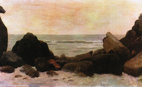 Albert Bierstadt created this oil on paper, Sea Lions, Farallon Islands, likely in the second half of the 19th century. The painting is divided into three horizontal bands: sea lions in the foreground, waves in the middle ground, and sky at the top. The use of impasto in the waves creates a sense of texture, and the artist employs diagonal lines to convey movement, suggesting a turbulent sea. The arrangement of the sea lions on the rocks introduces a rhythmic pattern, guiding the viewer's eye across the canvas. The painting can be read through the lens of structuralism, in which the sea lions, waves and rocks can be seen as signs or signifiers within a broader cultural discourse of the Pacific Coast. The way the brushstrokes are used and how colors are applied function within the context of 19th-century aesthetic and philosophical ideas. Bierstadt's work, with its emphasis on the picturesque, engages with new ways of thinking about space, perception, and representation. The textured, broken surfaces of the rocks challenge any fixed meaning, offering a space for continuous interpretation.